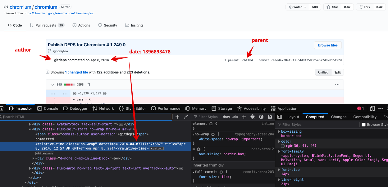 Идём на сайт, где лежит репозиторий Хромиума. Ищем там коммит попроще: без мёрджей и с коротким описанием. Благо он там на ребэйзах построен и не ветвится. Короткие описания там на релизных коммитах.